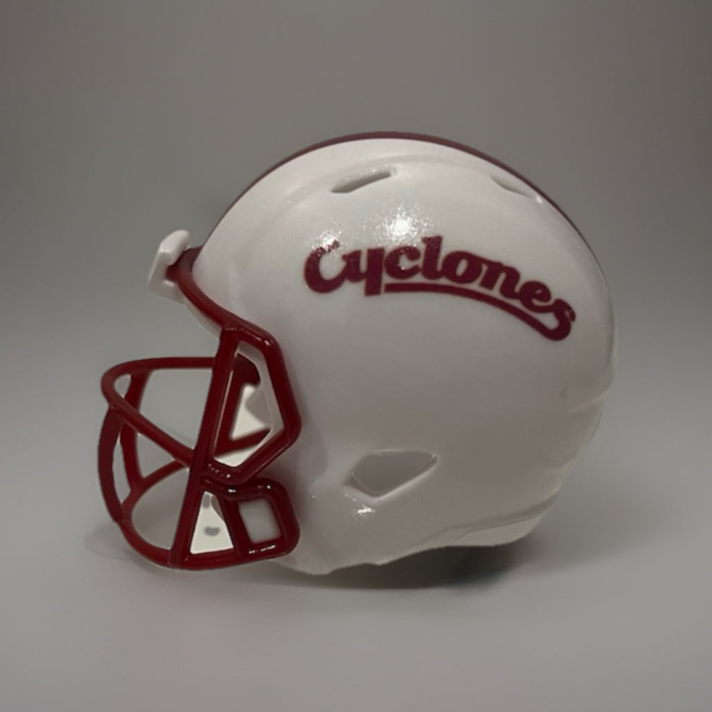 Custom Iowa State Cyclones Pocket Pro Helmet. 2" height, 2.25" length, 1.75" width. Email PocketProNation@gmail.com for custom inquiries or questions. Handling time typically 3 business days.